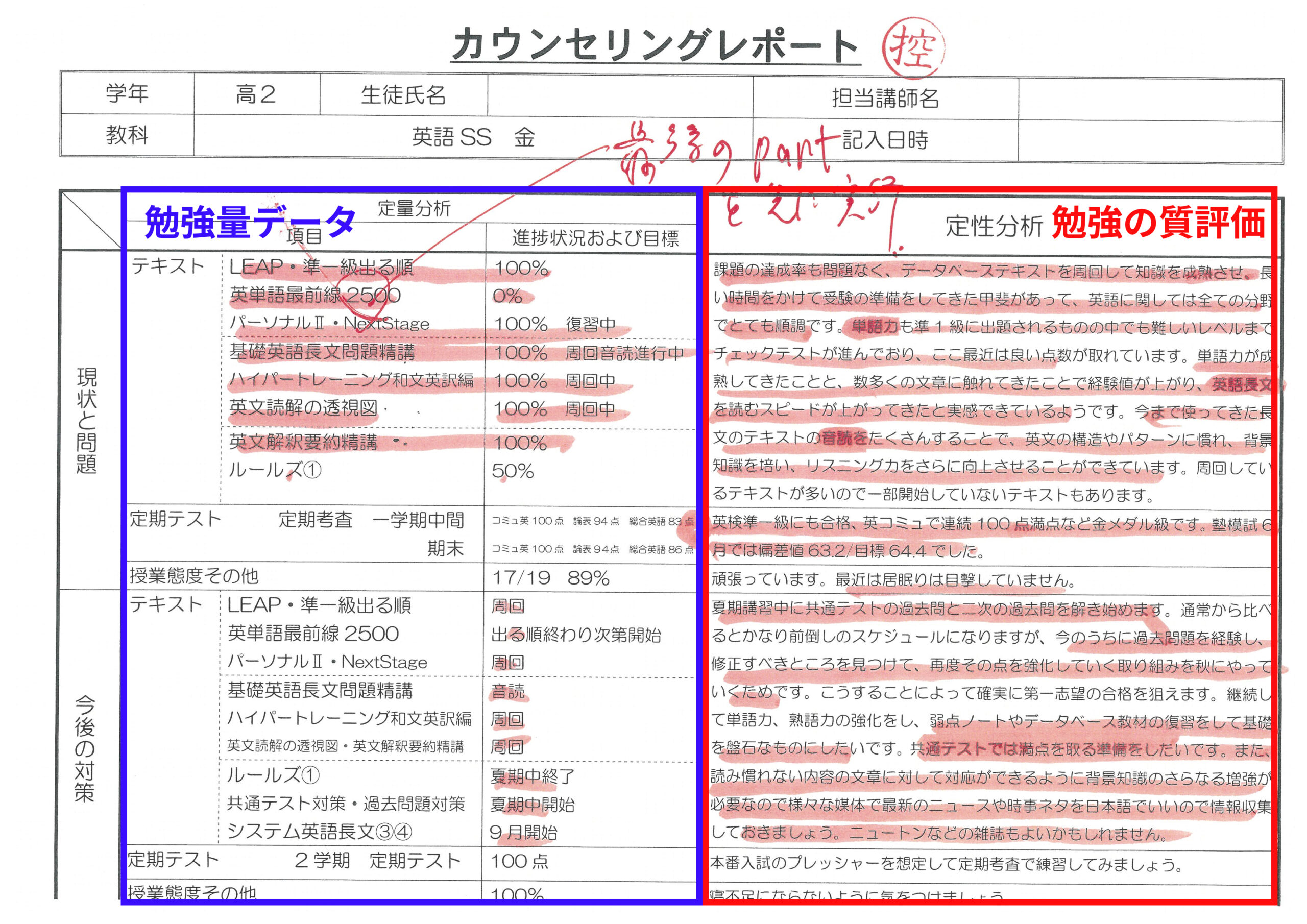 HASHIKENの講師は、カウンセリングレポートを通して、生徒の「学習の質と量」を総合的に把握し、一人ひとりに最適化された指導を提供しています。