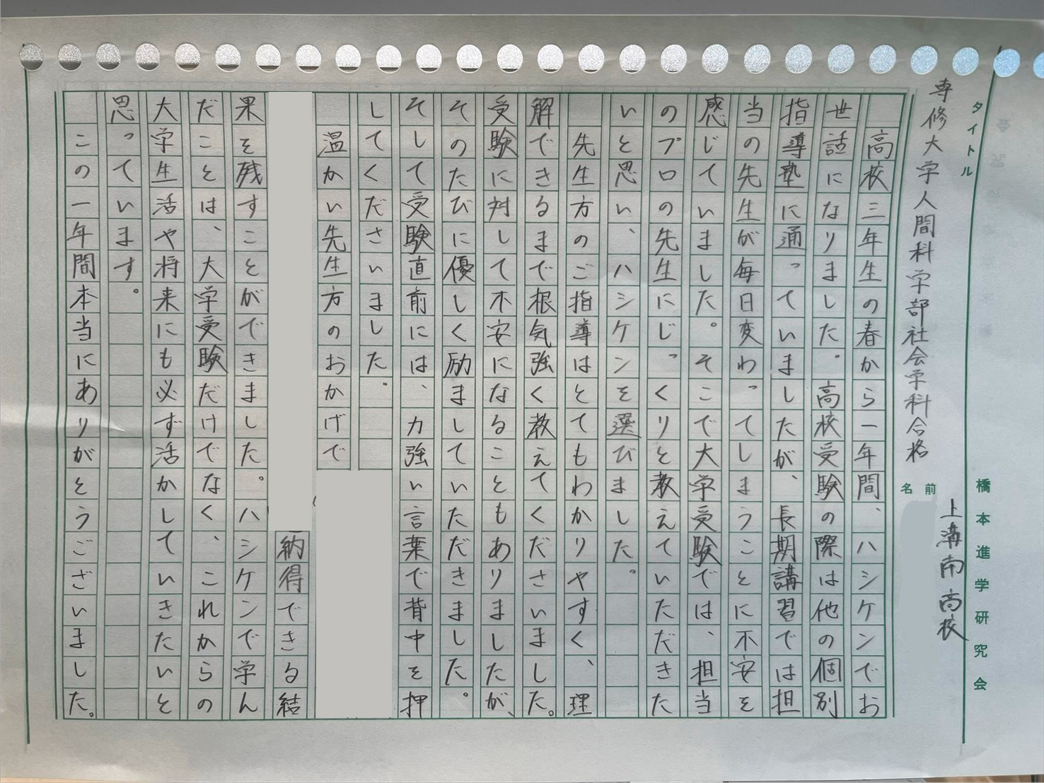 ハシケンで学んだことは大学受験だけでなく、これからの大学生活や将来にも必ず生かしていきたいと思っています。